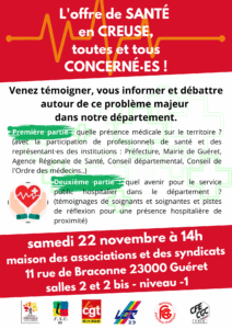 Des organisations syndicales et associations creusoises organisent un colloque au sujet de l’offre de santé en Creuse le samedi 22 novembre et vous invite à participer à cet évènement.