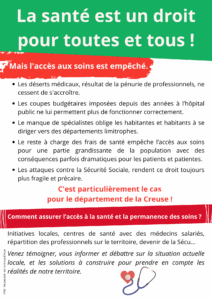 La santé est un droit pour toutes et tous, il est nécessaire que nous puissions débattre, échanger avec des professionnels de santé mais aussi des représentant·es des institutions creusoises afin de construire, collectivement, des réponses adaptées au contexte local et aux besoins identifiés sur le terrain !