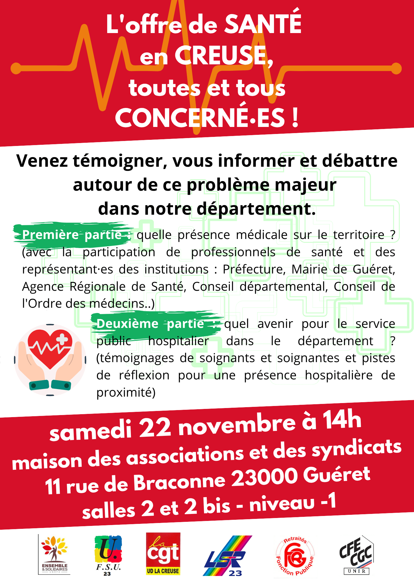 La santé est un droit pour toutes et tous, il est nécessaire que nous puissions débattre, échanger avec des professionnels de santé mais aussi des représentant·es des institutions creusoises afin de construire, collectivement, des réponses adaptées au contexte local et aux besoins identifiés sur le terrain !
