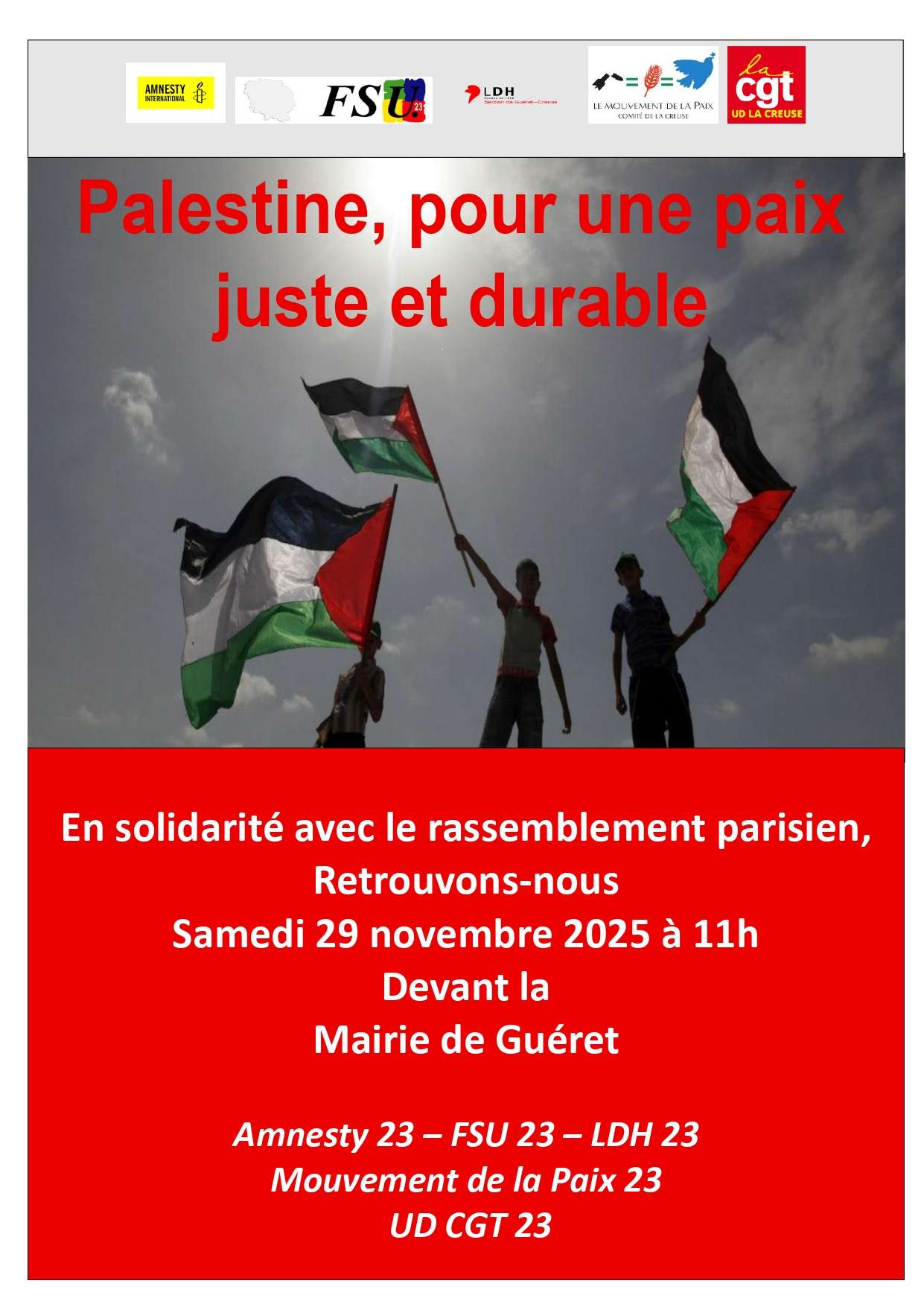 Amnesty 23, FSU 23, LDH 23, Mouvement de la Paix 23, UD CGT 23.